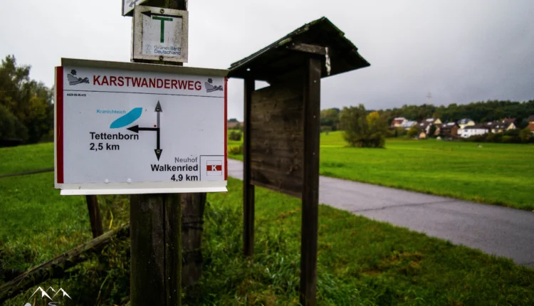 Von Neuhof aus machen wir uns auf den Weg nach Norden und folgen den Markierungen des Karstwanderwegs. Schon bald führt der Weg steil bergauf, denn die nächste Stempelstelle befindet sich oben auf dem Sachsenstein. Auf dem Weg nach oben werfen wir einen Blick auf die beeindruckende Steilwand des Sachsensteins, die etwa 30 Meter hoch ist.